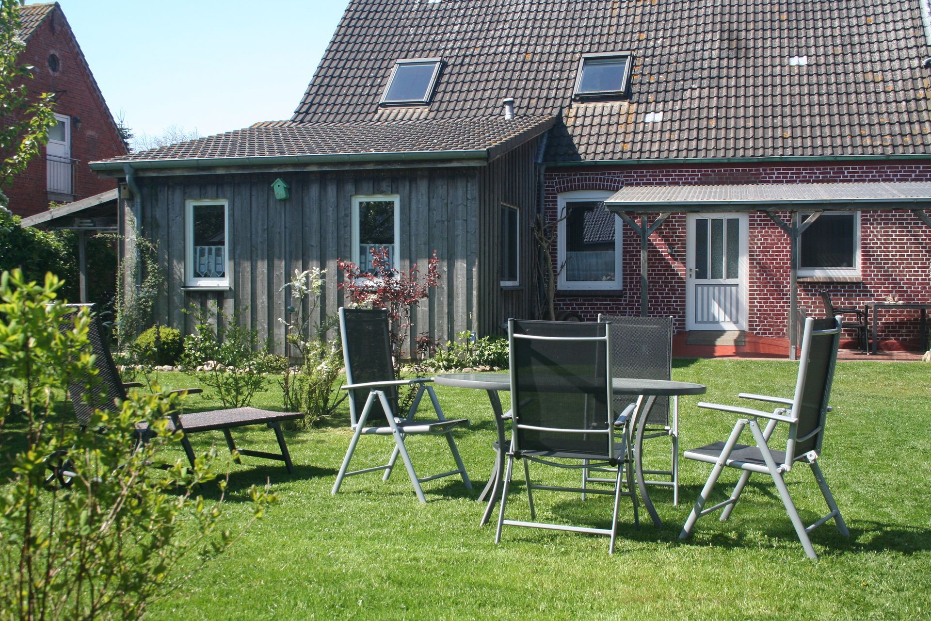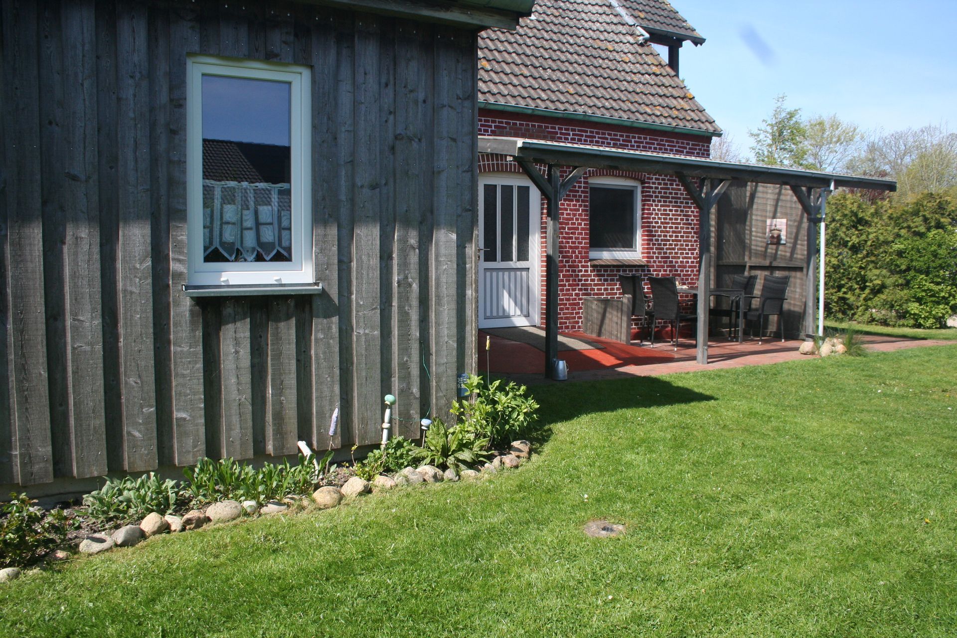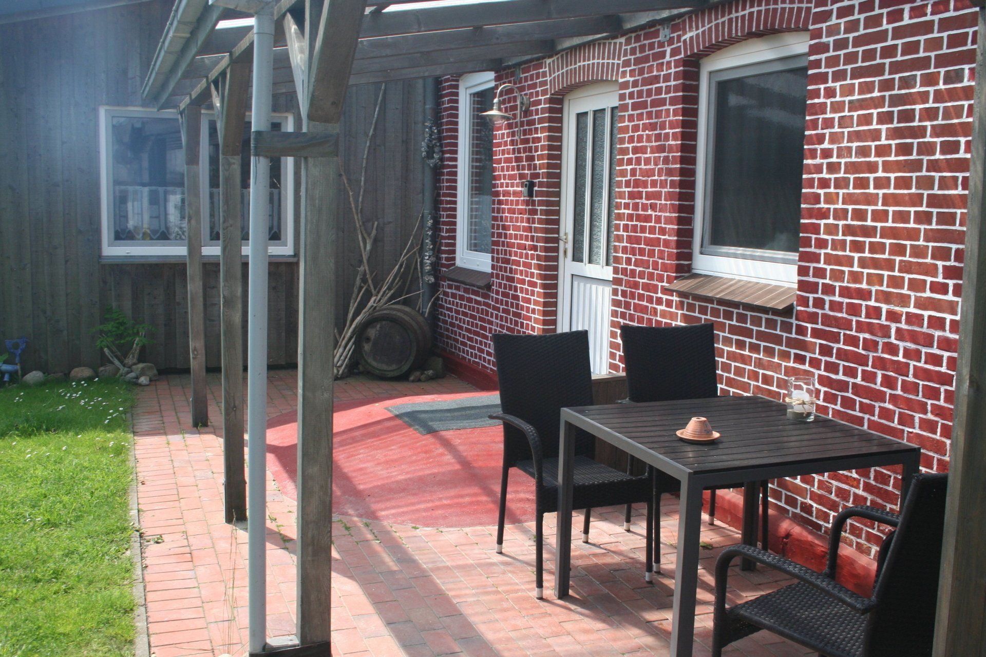 Vor ihrer Wohnungstür befindet sich der ein überdachter Außenbereich und Sitzgelegenheiten im Garten