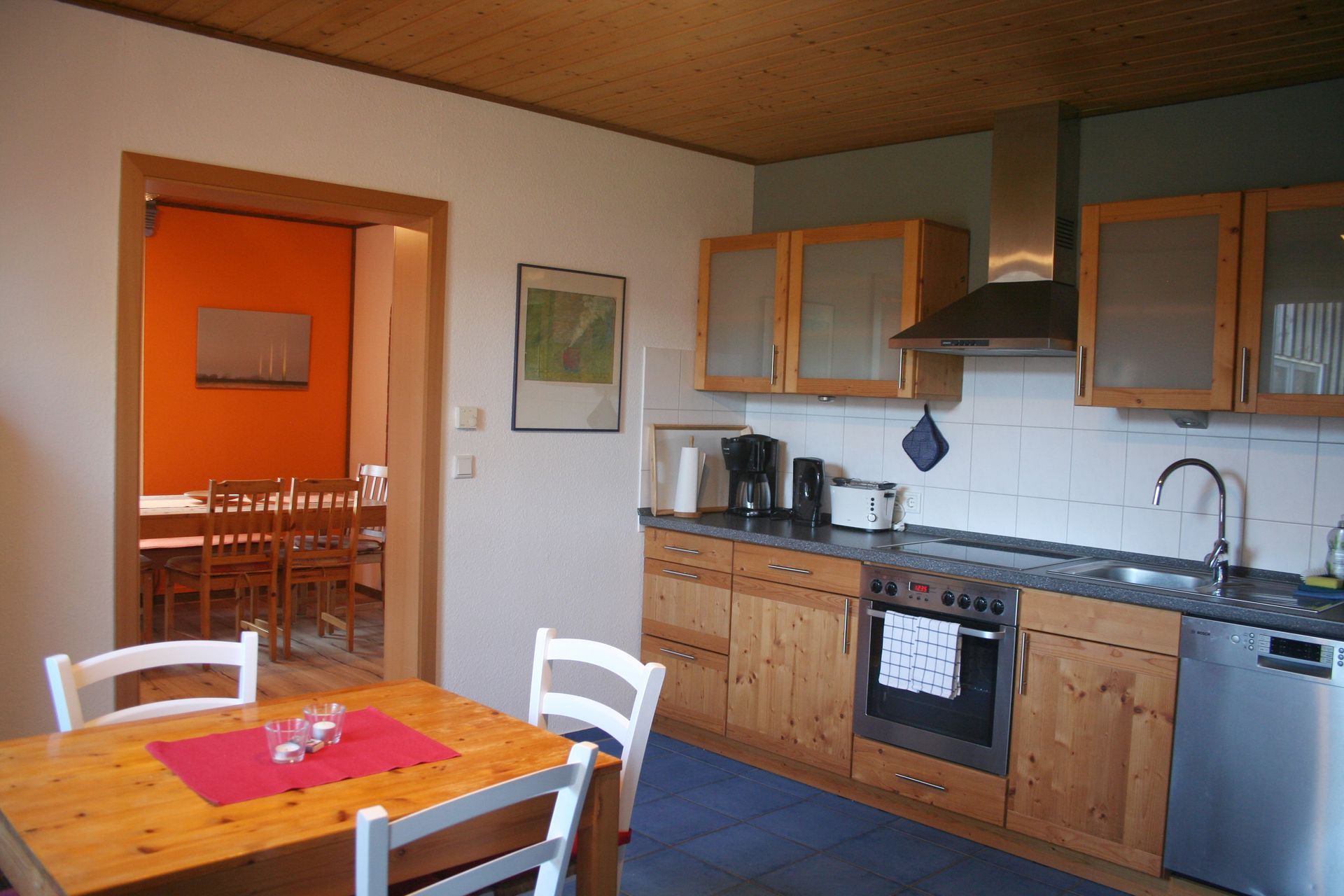Küche mit Cerankochfeld, Backofen, Mikrowelle, Geschirrspüler, Wasserkocher