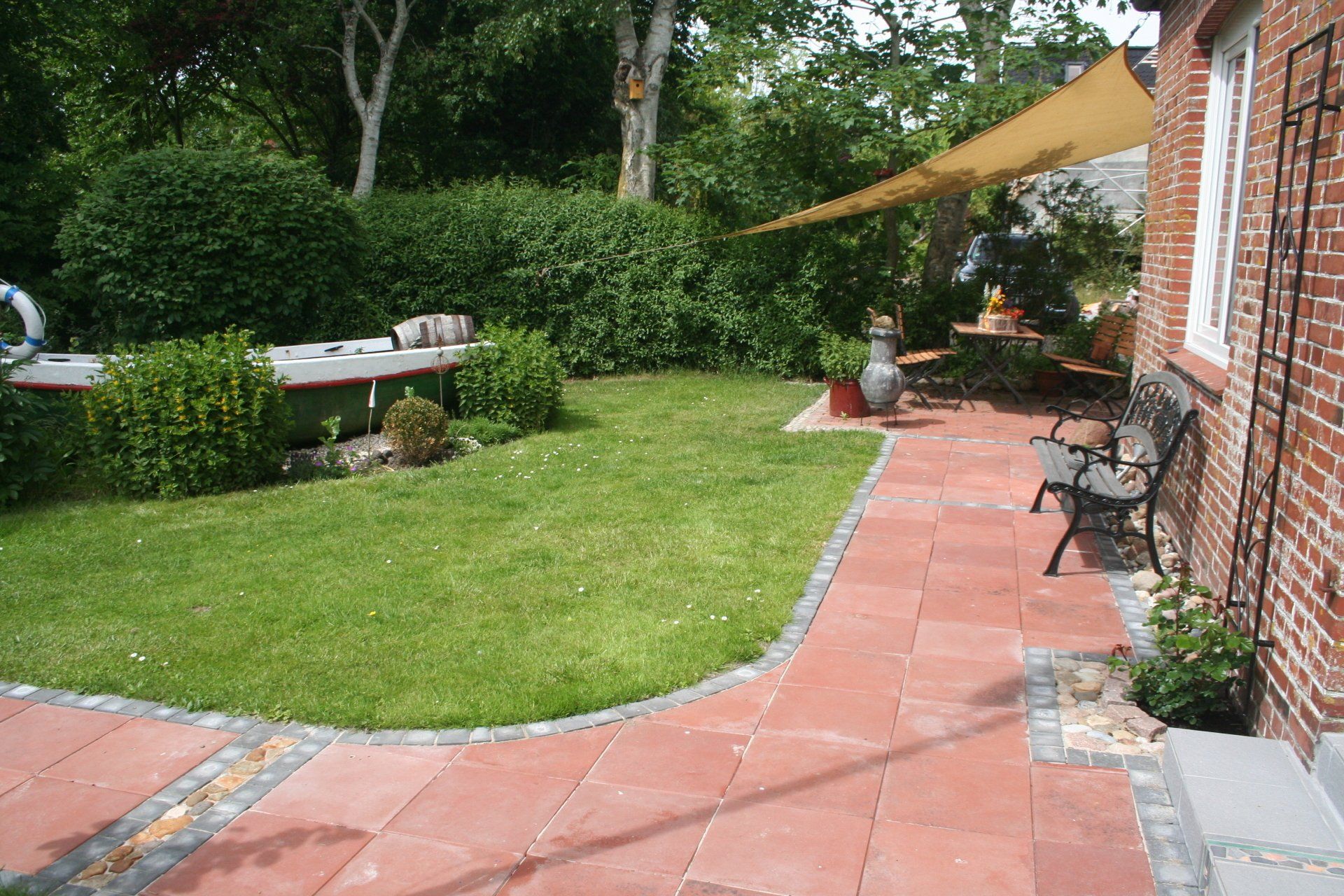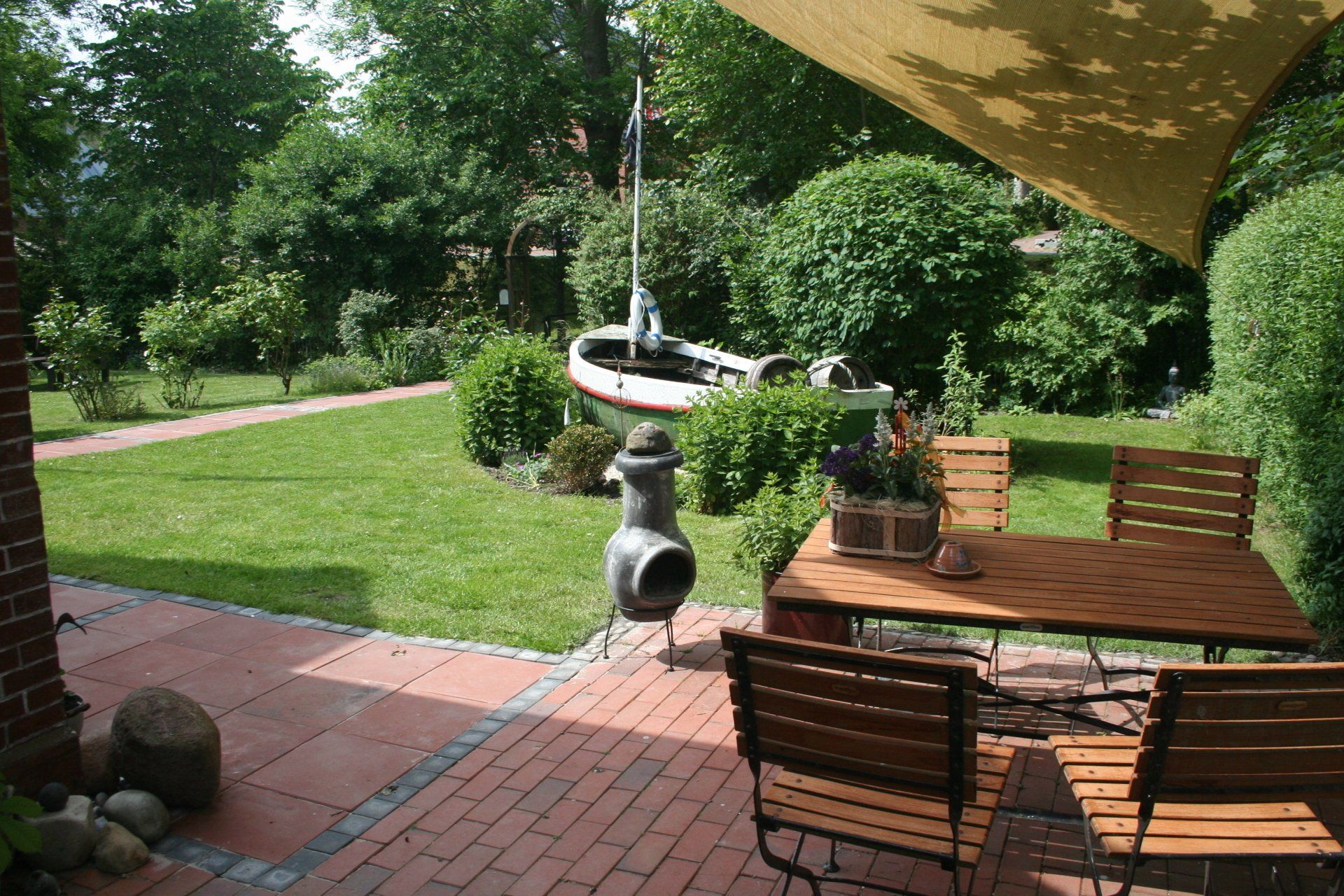 vor ihrer Eingangstür befindet sich ihr eigener Außenbereich mit Sitzgelegenheit im Garten.