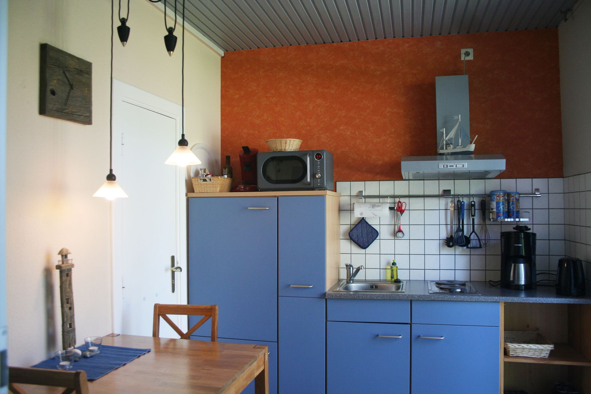 2-Plattenherd, Mikrowelle, Kaffeemaschine (Filter oder Pads), Kühlschrank, Wasserkocher